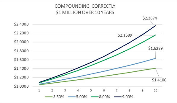 ​​​​​​​​​​​​As shown below: Over time, the compounding rate is the most important variable for an income portfolio or allocation. The difference can be hundreds of thousands of dollars in withdrawals or additional savings. The difference between 5% and 8% for a $1 million account is $503,000 over 10 years. The objective of Smart Yield is to increase the interest rate or compounding rate.
